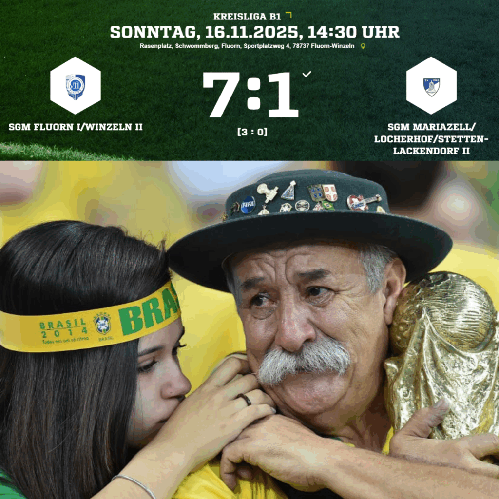 Das Ergebnis? Ein saftiges, schmerzhaftes 7:1 für die SGM Fluorn I/Winzeln II. Autsch! Unser Passspiel? Puh. Das war heute unordentlicher als jede Vierer-Studenten-WG die seit drei Wochen vergessen hat, dass Geschirr eigentlich nichts im Bad zu suchen hat. Es sah phasenweise eher nach einer Partie Wikinger Schach aus als nach organisiertem Fußball. Ideen? Fehlanzeige. Struktur? Gesucht und nicht gefunden. Nach vorne? Chancen gehabt, aber so konsequent vergeben wie ein Veganer vor dem Grillbuffet. Hinten? Tore kassiert wie Payback-Punkte – nur leider doppelt so schnell. Eine toxische Mischung, würde ich sagen! Halbzeit: 3:0 und genauso verdient Wirklich jeder lange Ball der Gegner schien heute gefühlt im Gegentor zu enden. Ganz ehrlich, unsere Mannschaft hatte heute einen konfuseren Auftritt als Thomas Gottschalk beim Bambi. Das bescheidene Wetter passte wenigstens zum Soiel. Es regnete. Es war kalt.Es war grau. Was dieses schei** Spiel perfekt abrundete. Der Endstand von 7:1 spricht Bände. Da gibt es nichts schönzureden.