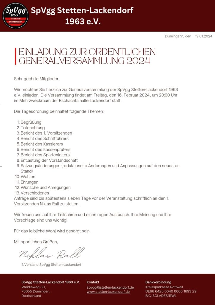 Die diesjährige Generalversammlung der SpVgg Stetten-Lackendorf 1963 e.V. findet am Fr., 16.02.2024, um 20 Uhr im Mehrzweckraum der Eschachtalhalle Lackendorf statt.